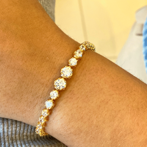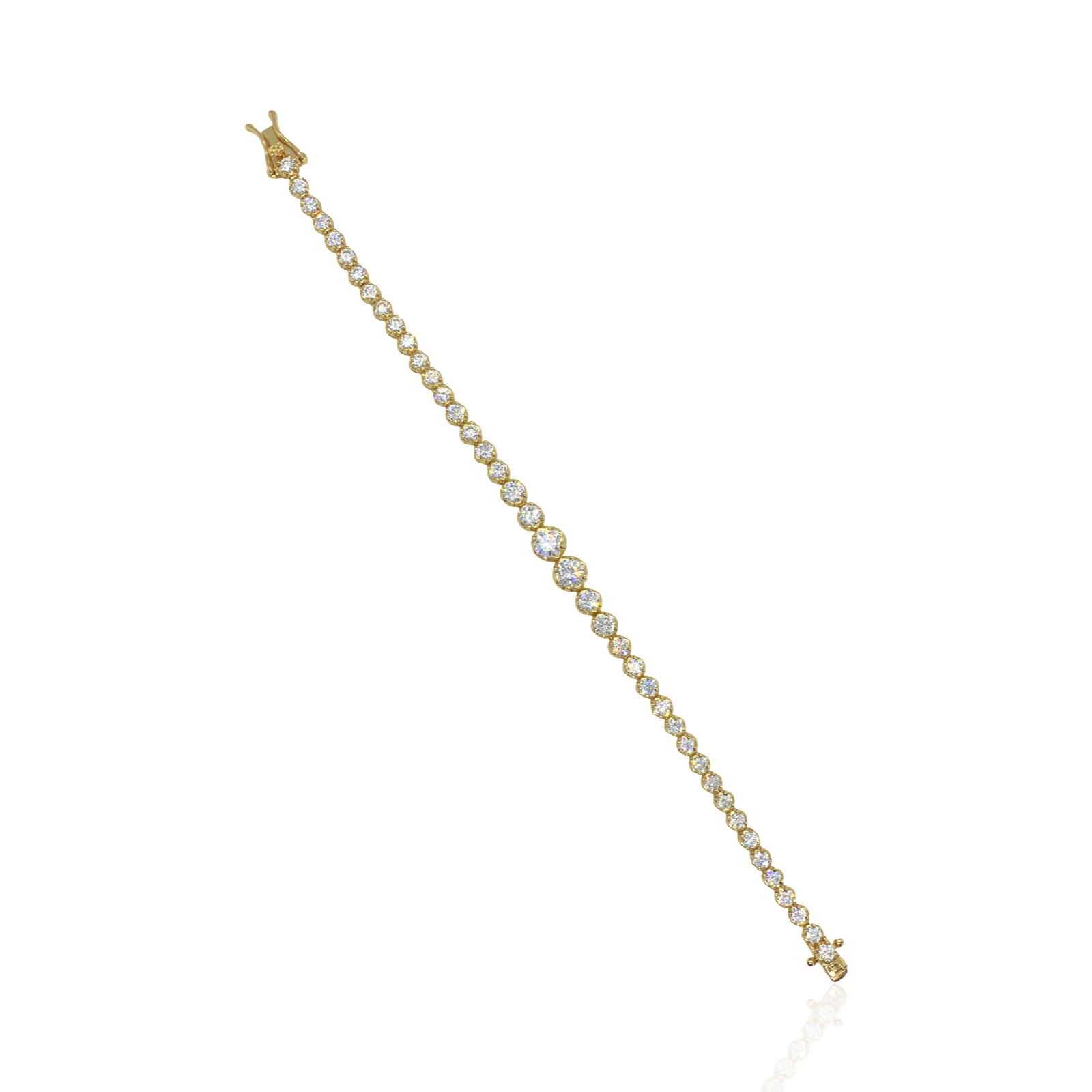 Pulseira semijoia banho ouro 18k. Modelo riviera toda em pontos de luz redondos, 4 garras, em tamanhos decrescentes. Fecho gaveta. Niquel free