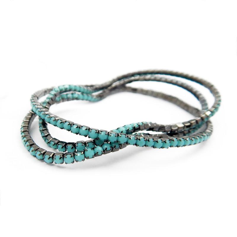 Pulseira semi joia banho ródio negro. Trio em silicone todo strass turquesa.