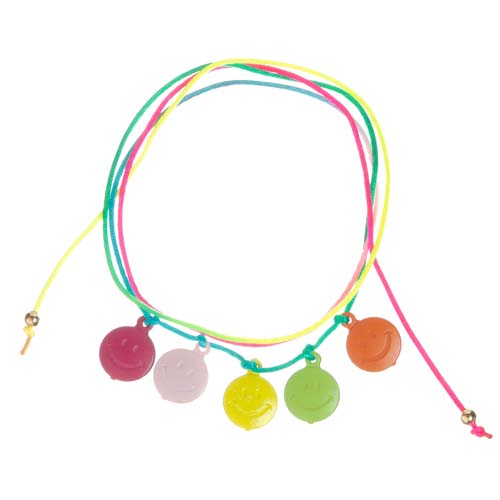 Pulseira versátil em bijuteria. Pode-se ser usada como colar ou tornozeleira. Fio de seda longo e duplo, sem fecho, com 5 berloques smile, de resina e multi coloridos.